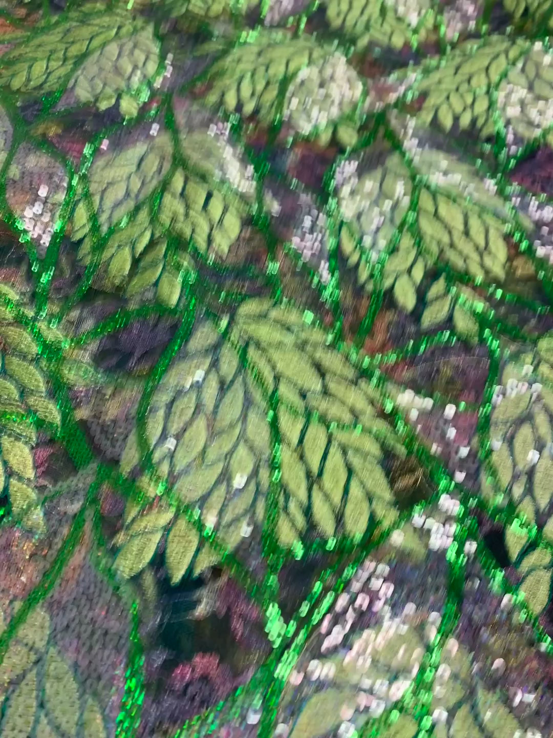 The lightweight mesh base allows for breathability and drape, while the raised leaf appliqué—outlined in gold metallic stitching and scattered with silver sequins—adds depth.