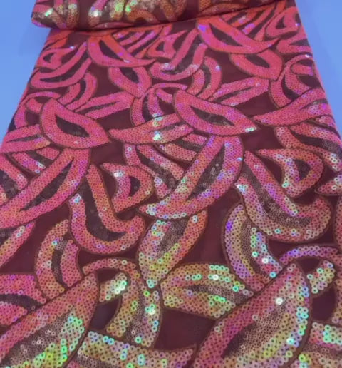 Interlocking Loop Abstract Motif Sequin Lace Print Fabric with Sheer Tulle Base